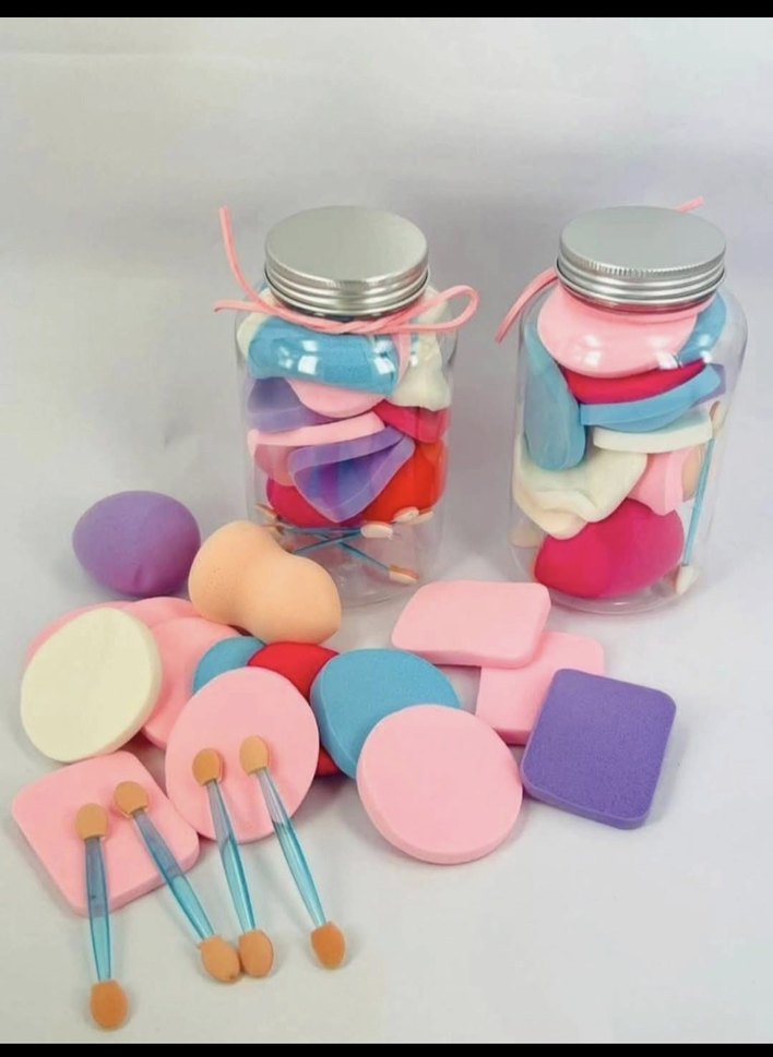 Farklı şekillerde ve yumuşak dokuda pastel renkli makyaj süngerleri ve aplikatör fırçalarından oluşan set, şeffaf kavanozlarda saklanmaktadır.