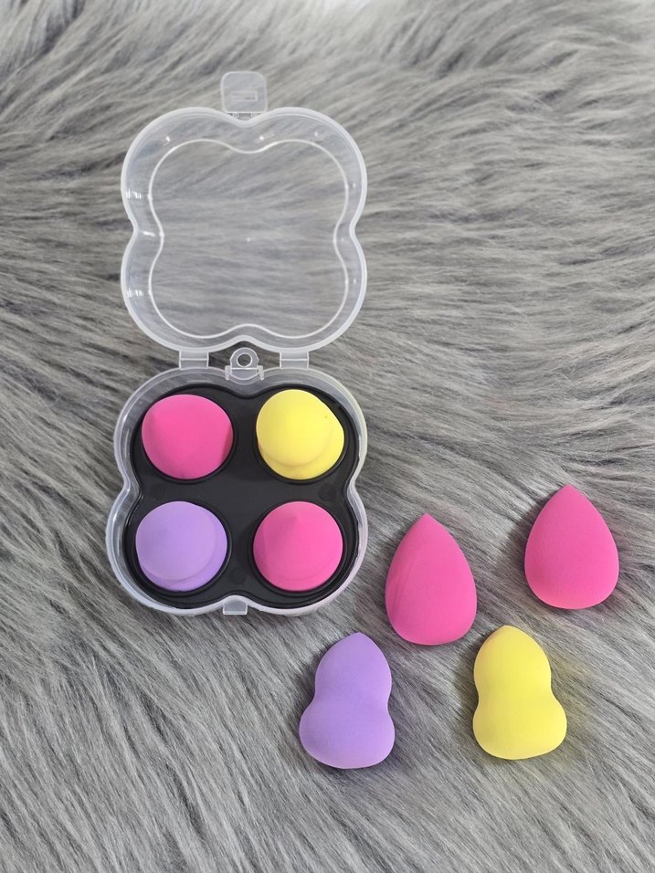 Farklı şekillerde pastel renkli makyaj süngerleri, şeffaf kutuda saklanır. Pürüzsüz makyaj için uygundur.