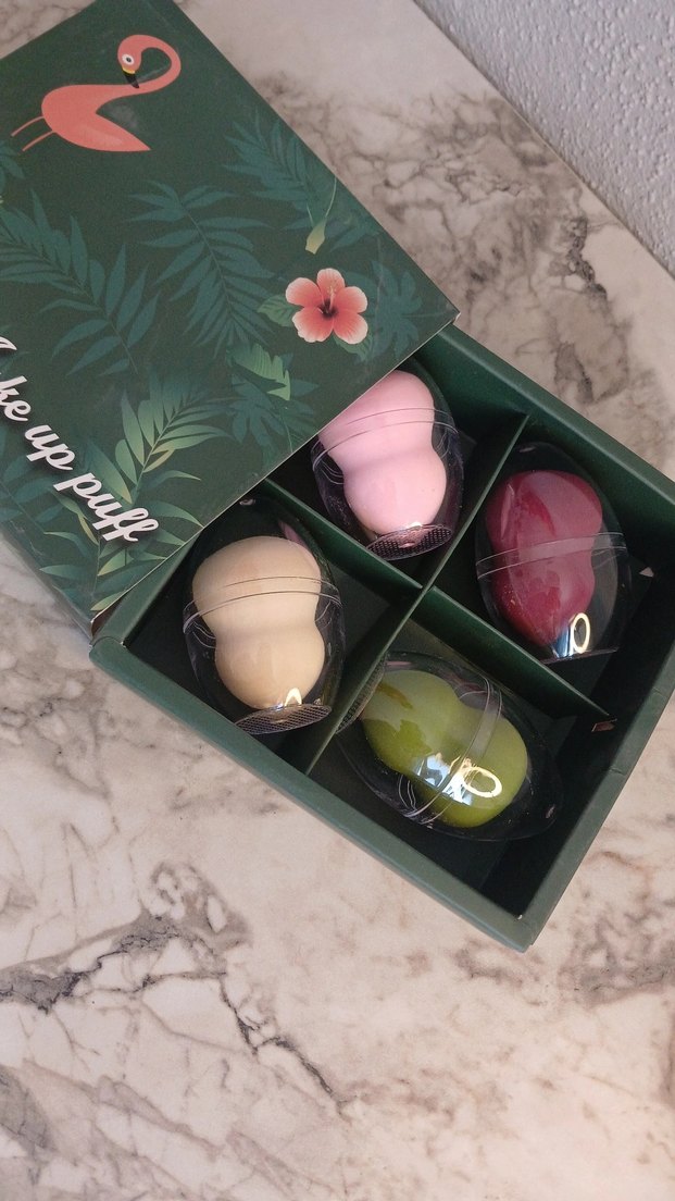 Pembe, bej, bordo ve yeşil pastel tonlarda dört adet makyaj süngeri seti, pürüzsüz dokusuyla makyaj uygulamasını kolaylaştırır.