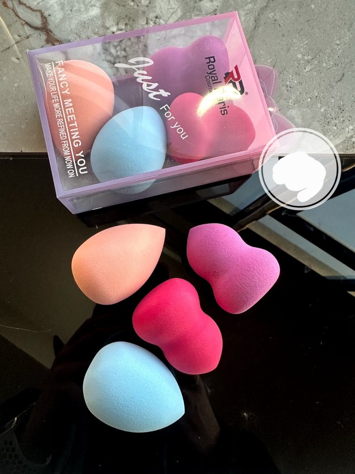Çeşitli şekillerde, yumuşak dokulu pastel renkli makyaj süngerleri seti. Ambalajda "Royal" yazısı yer alır.