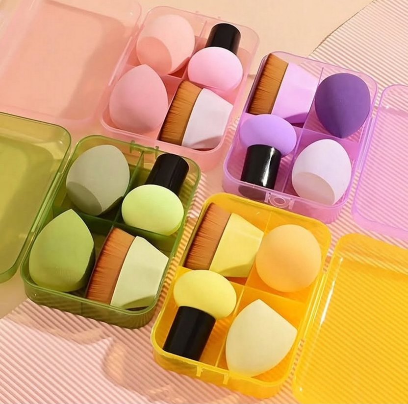 Pastel renklerde farklı şekillerde makyaj süngerleri ve fırçalar içeren set, kompakt kutularda saklanır. 4 farklı renk seçeneği ile..