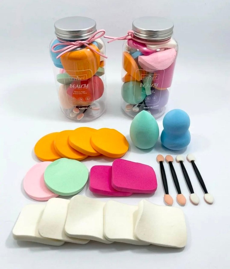 Farklı şekil ve boyutlarda pastel renkli makyaj süngerleri ve aplikatörlerin bulunduğu set, şeffaf kavanozda ve kurdeleli.