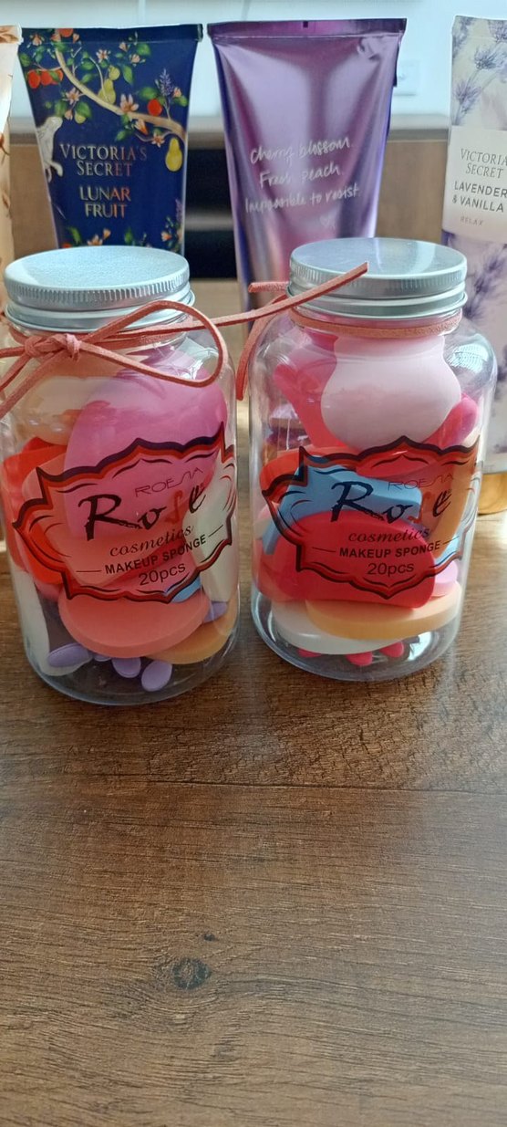 Pastel tonlarda, farklı şekillerde 20 adet pembe makyaj süngeri içeren set. Metal kapaklı cam kavanozda saklanır.