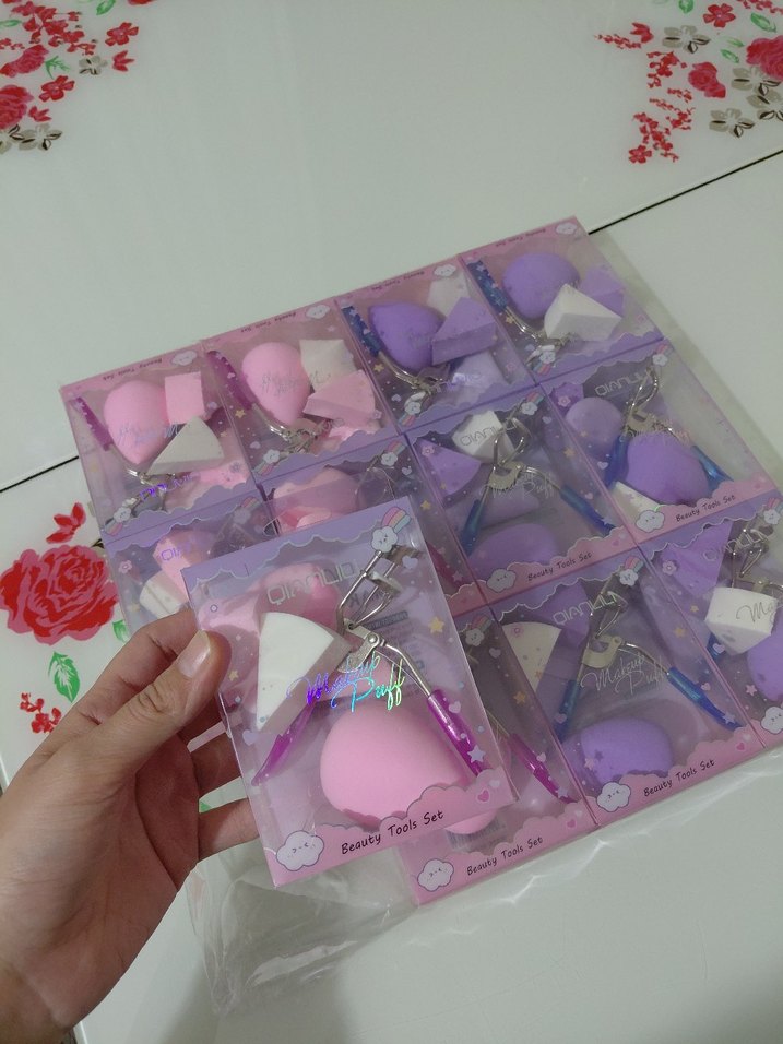 Pembe ve mor pastel renklerde makyaj süngeri setleri, sünger, blender ve aplikatör araçları içerir. Yumuşak ve nazik dokunuş sağlar.