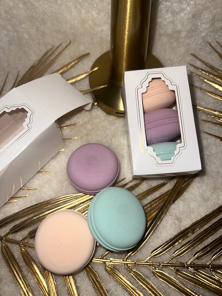 Mor, şeftali ve nane tonlarında pastel renkli makyaj süngerleri seti, beyaz kutuda. Fondöten uygulaması için uygundur.