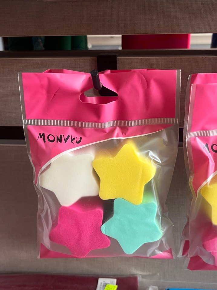 Beyaz, sarı, pembe ve mavi pastel renklerde farklı şekillerde makyaj süngerleri seti. Pürüzsüz uygulama sağlar. Marka: MONVKU.