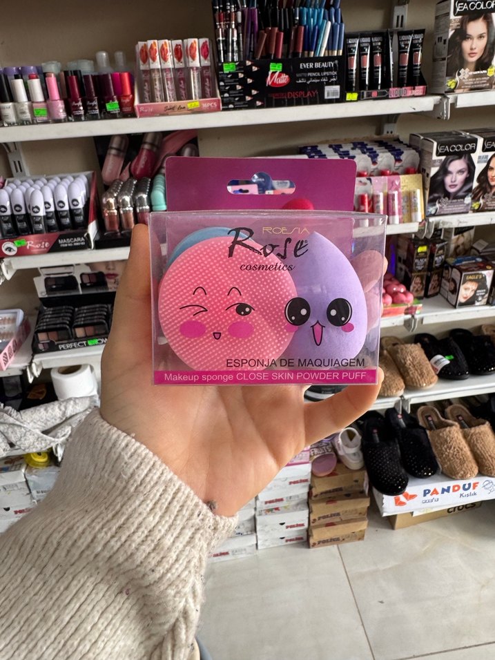 Pembe ve lavanta pastel renklerde, sevimli yüz desenli makyaj süngerleri seti, pürüzsüz pudra uygulaması için uygundur.