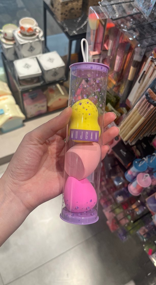 Sarı, şeftali ve pembe pastel tonlarında makyaj süngerleri, şeffaf tüp içinde VUJCAN markalı set.