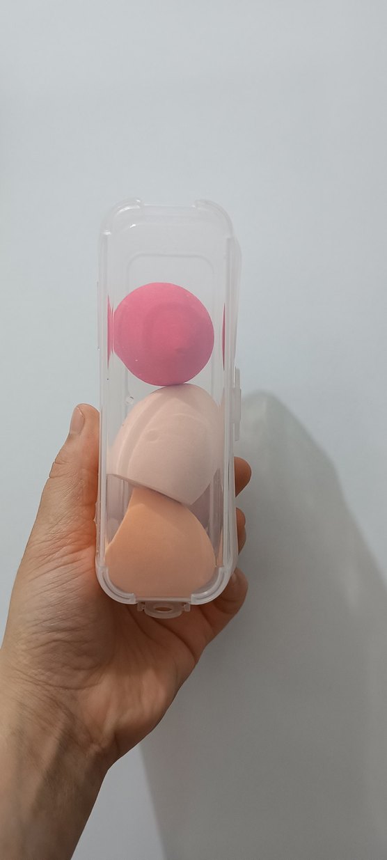 Şeffaf kutuda, pembe tonlarında üç pastel renkli makyaj süngeri seti. Pürüzsüz makyaj uygulaması için idealdir.