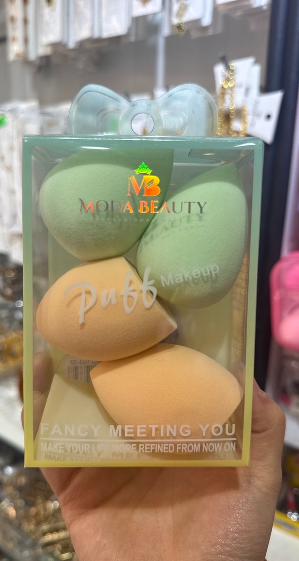 Farklı şekillerde pastel renkli makyaj süngerleri içeren set, pürüzsüz makyaj uygulaması sağlar. Ambalajda Mopa Beauty markası ve 'Fancy Meeting You' yazısı bulunur.