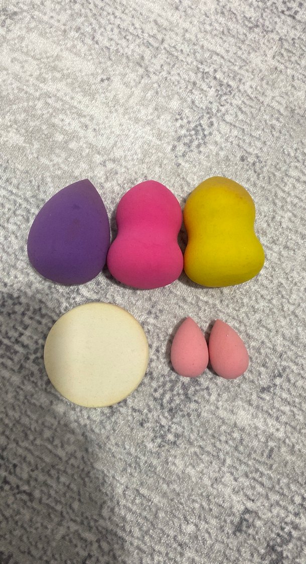 Farklı şekil ve boyutlarda pastel renkli beş parça makyaj süngeri seti, pürüzsüz uygulama için uygundur.