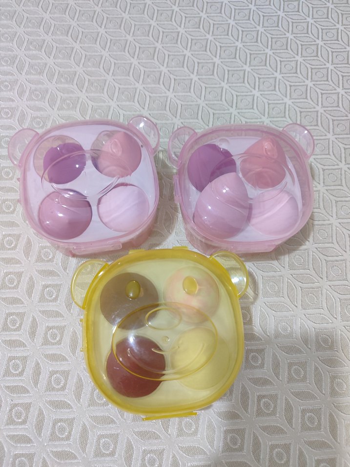 Pastel tonlarda çok renkli makyaj süngerleri, ayı şeklinde şeffaf kutularda sunulmaktadır.
