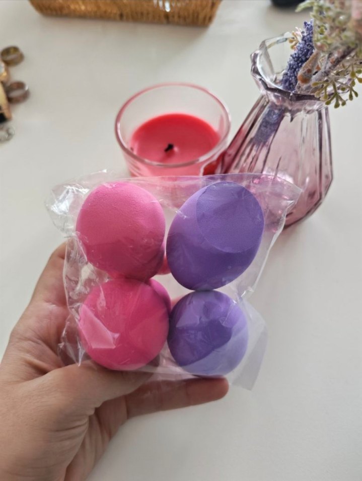 Mor ve pembe tonlarında pastel renkli dört adet makyaj süngeri seti, pürüzsüz uygulama sağlar. Sıfır POŞETLİ ürün