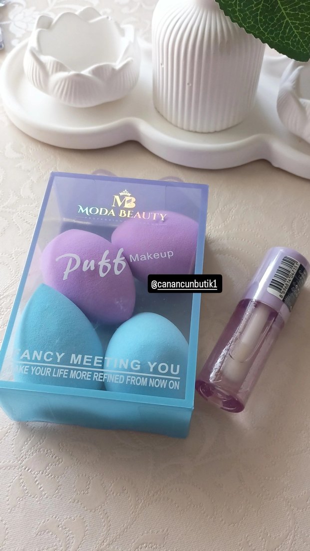 Pastel tonlarda mor ve mavi makyaj süngerleri içeren set, pürüzsüz makyaj uygulaması sağlar. Moda Beauty markalı şeffaf kutuda. ikili set dudak parlatıcı ile bilikte gönderilir