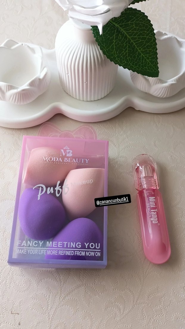 Pembe ve mor pastel tonlarında makyaj süngerleri seti, pürüzsüz uygulama sağlar. Mini Tango makyaj aracı da dahildir. ikisinin fiyatıdır