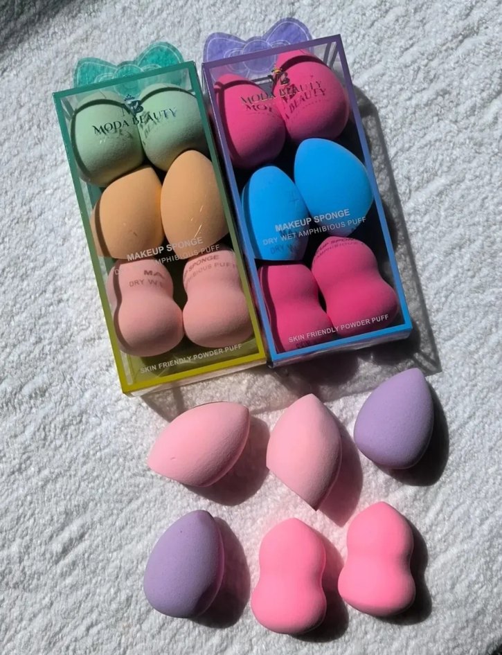 Farklı şekillerde ve pastel tonlarda makyaj süngerleri seti, pürüzsüz uygulama için ideal. Canlı pembe, mavi, mor, şeftali ve yeşil renkler içerir.