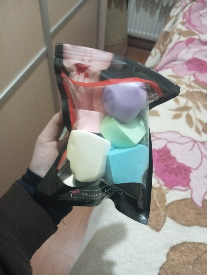 Farklı şekillerde, pastel renklerde makyaj süngerleri seti. Pürüzsüz fondöten uygulaması için uygundur.