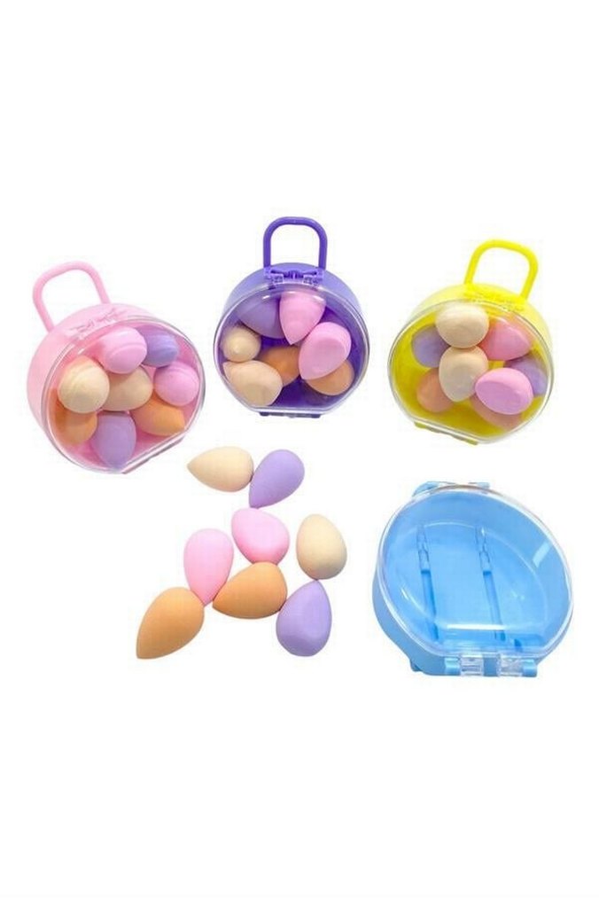 Çeşitli şekillerde pastel renkli makyaj süngerleri, pratik kutularda saklanır. Pürüzsüz makyaj için uygundur.
