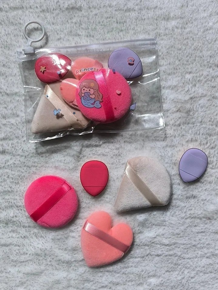 Pastel tonlarda pembe ve mor makyaj süngerleri ve pufflar, kalp ve yuvarlak şekillerde, şeffaf bir çanta ile birlikte.(Marka temsilidir.)