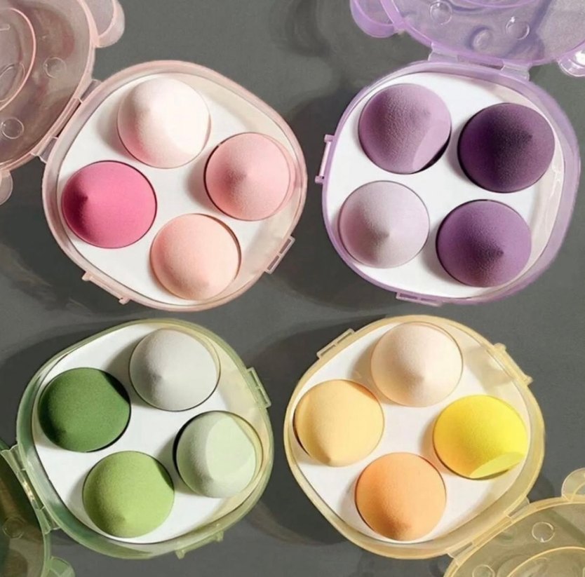 Pastel tonlarda, yumuşak renklerde makyaj süngerleri seti, kompakt kutularda saklanır. Pürüzsüz makyaj için uygundur.