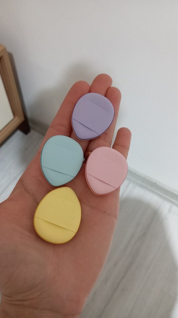 Yumuşak dokulu, pastel tonlarda çeşitli renklerde makyaj süngerleri seti. PEMBE OLANI BİR KEZ KULLANDIM TRANSPARAN PUDRAYA SÜRMÜŞTÜM