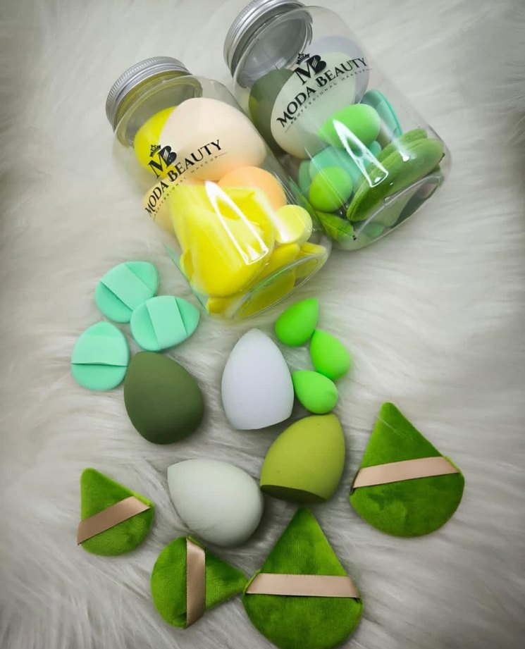 Pastel renklerde, farklı şekillerde makyaj süngerleri ve yeşil kadife yüz puffları, pürüzsüz makyaj uygulaması için uygundur.