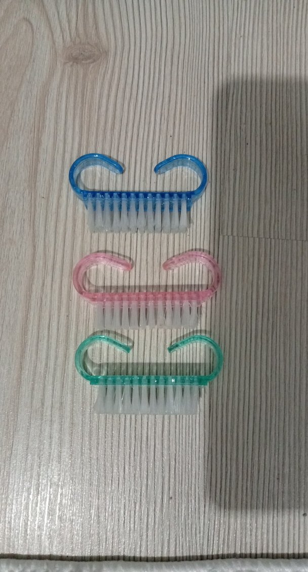Pastel renklerde, tırnak temizliği için kıvrımlı saplı ve beyaz kıllı manikür pedikür fırçaları seti.