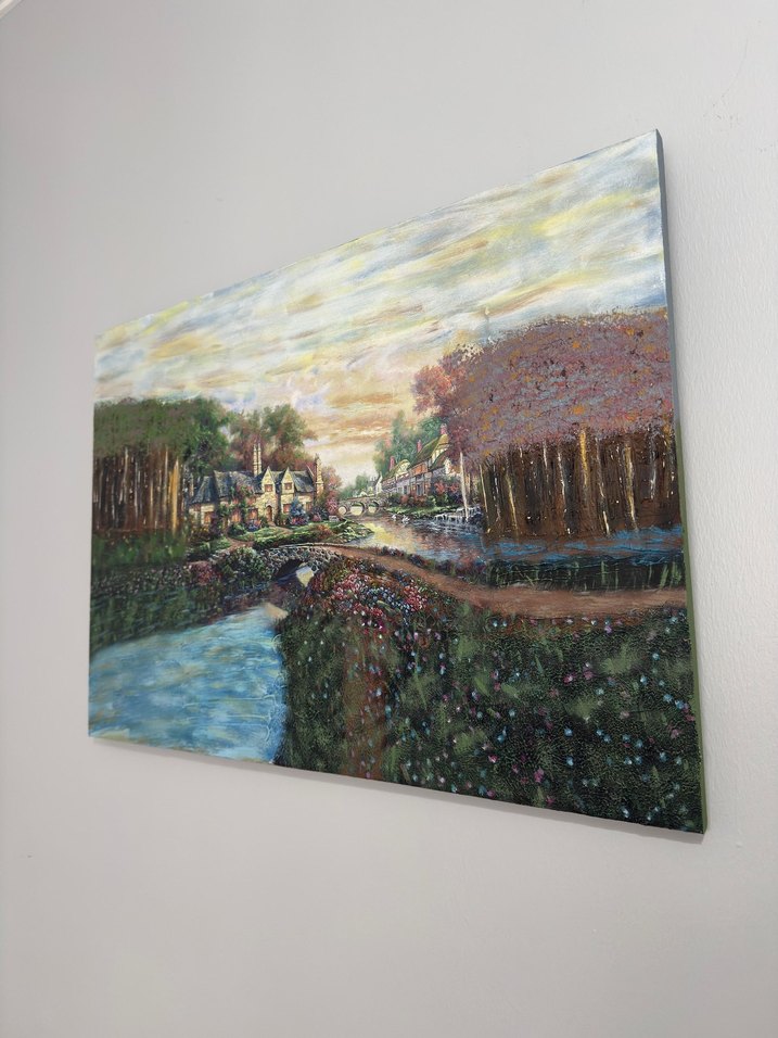 Pastel renklerde, çok renkli ağaçlar, nehir ve evler içeren manzara tablosu.