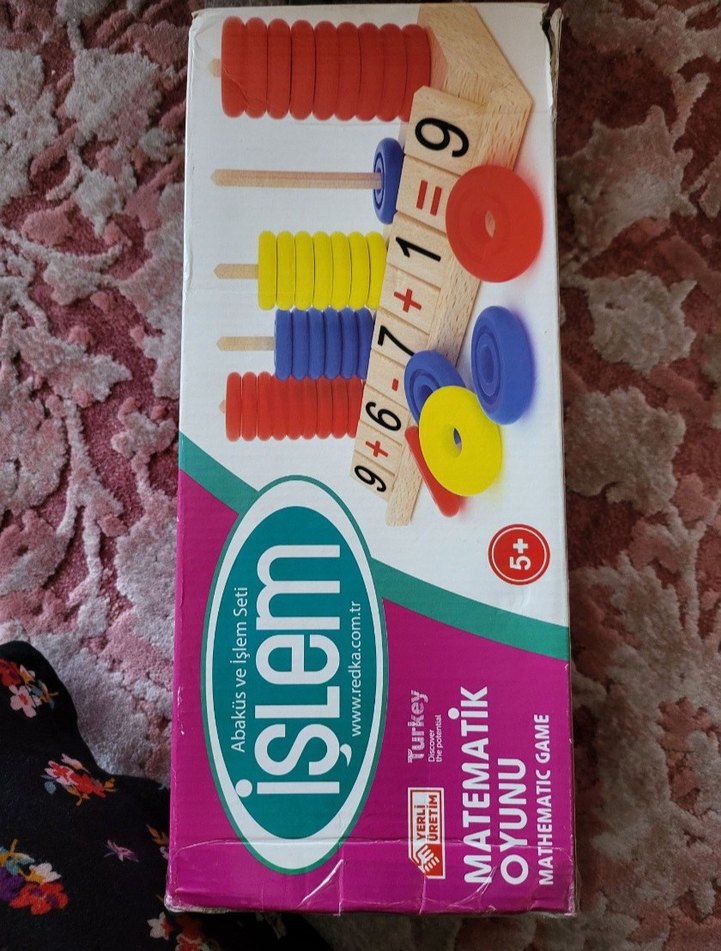 Pastel renklerde sayma diskleri ve tahta çubuklar içeren eğitim oyunu. Toplama ve çıkarma kartlarıyla matematik çalışılabilir. 5 yaş ve üzeri için uygundur. 20 adet mavi 19 sarı ve kırmızı halka var geri kalan her sayı ve işaretten 2 adet var sadece 8 bir adet onu da kartondan yaptım başka bir kusuru yok
