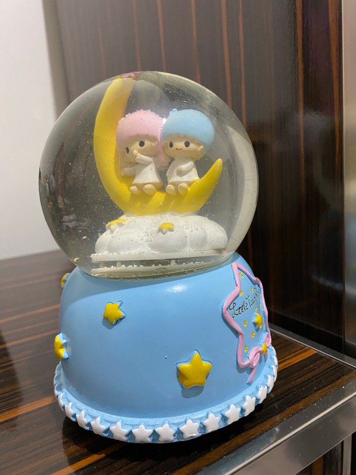 Pastel mavi renkte, ay şeklinde sarı oturma alanında iki figür bulunan kar küresi. Alt kısmı sarı yıldızlar ve pembe yıldız figürle süslenmiştir. ❄️ eski sevgilimin hediyesi alt kısımda sıkıntısı var ustaya götürünce yapar