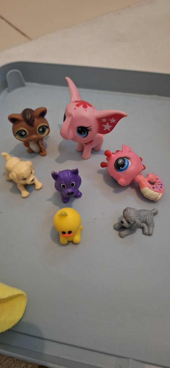 Pastel tonlarda pembe fil, sarı ördek ve çeşitli hayvan figürlerinden oluşan küçük aksiyon figürleri seti.