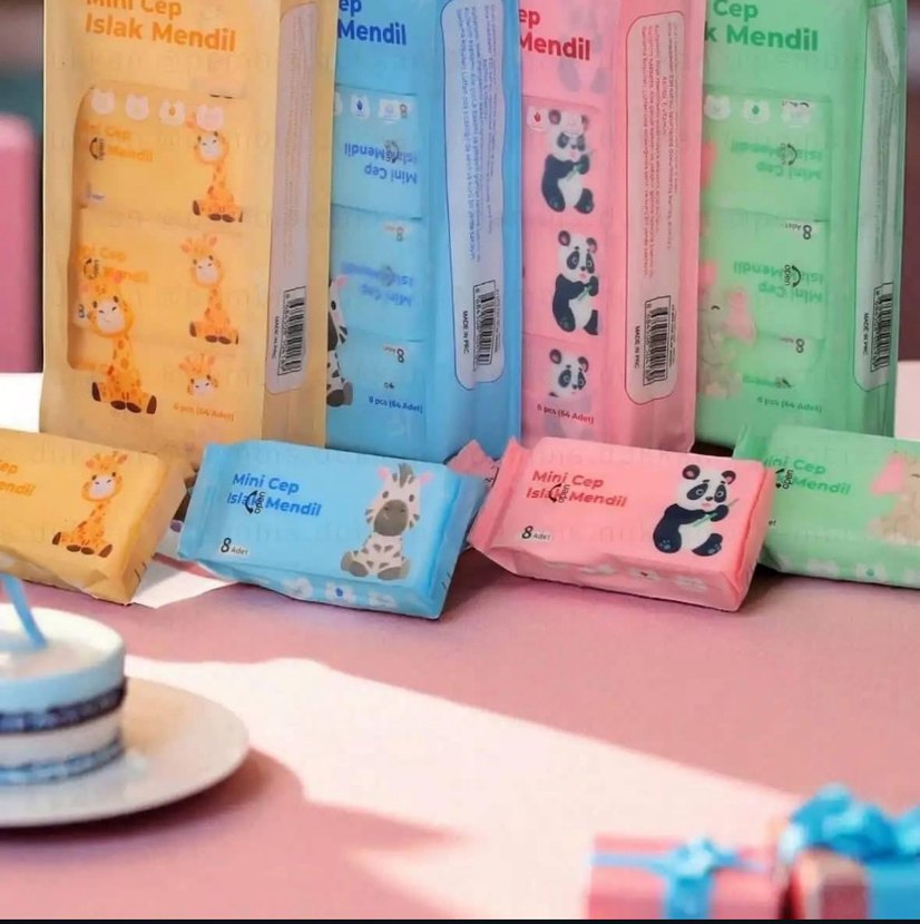Pastel renklerde, çeşitli hayvan desenli mini cep mendil seti. Her pakette 8 adet mendil bulunur, kolay taşınabilir.