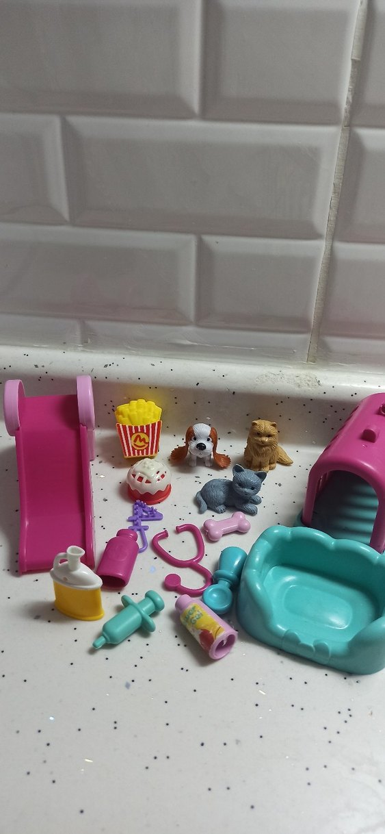 Pastel pembe ve mavi renklerde, kaydırak, taşıma kutusu, mama kabı, şırınga, stetoskop ve küçük evcil hayvan figürleri içeren mini oyun seti. hediye de koyuyorum