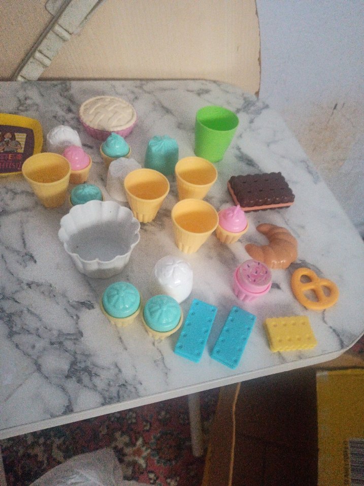 Pastel renklerde mini oyuncak bardaklar, tabaklar ve çeşitli yiyecekler içeren set. ️