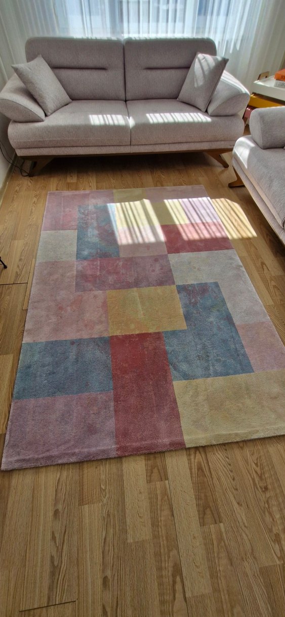 Yumuşak dokulu, pastel çok renkli blok desenli modern halı, her odaya sakin ve şık bir dokunuş katar.