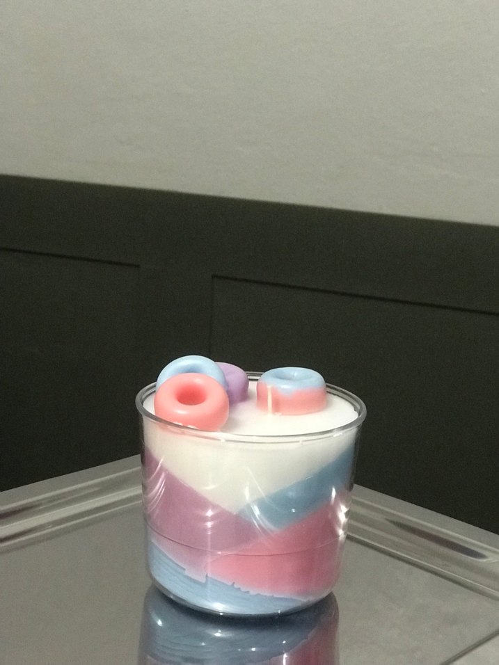 Yumuşak pembe, mavi ve mor tonlarında pastel renklere sahip mumlar, şeffaf bir tutucuda bir arada sunuluyor. ️parafin içermez,yandığında is izi olmaz.sağlıklı soya wax mum donut şekilleriyle göze hitap eden katmanlı mum serisi.. #layeredcandle #mumserisi