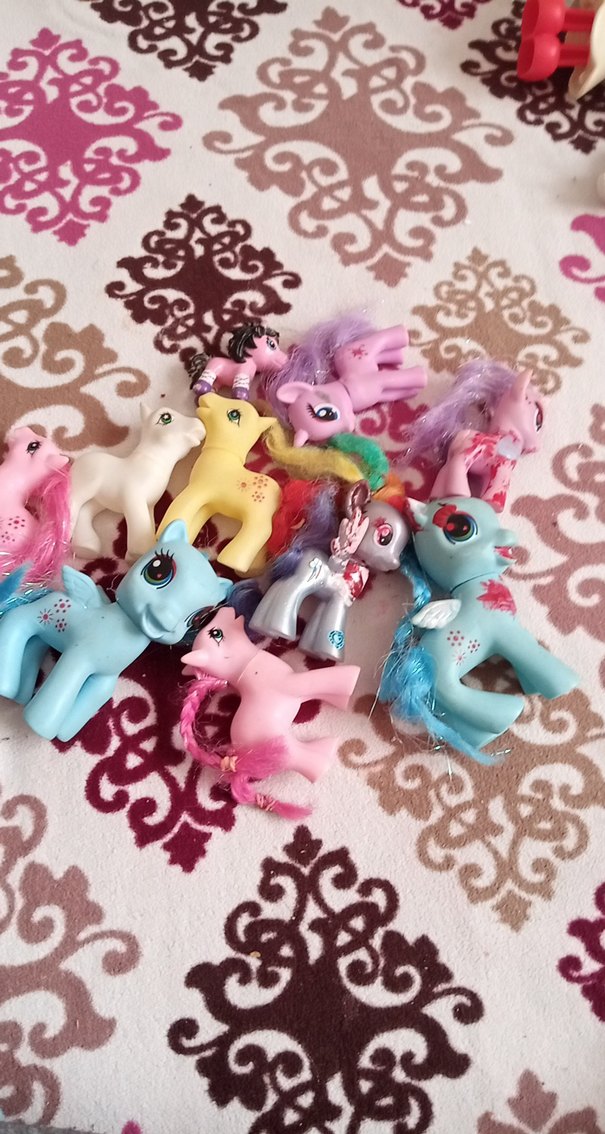 Çeşitli pastel renklerde, yumuşak yelelere sahip My Little Pony figürleri koleksiyonu.