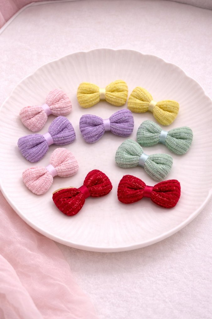 Yumuşak kumaştan yapılmış, nakışlı pastel renkli fiyonk tokalardan oluşan sade ve bohem tarzda çocuk aksesuar seti. Çift olarak satılır renk belirtin