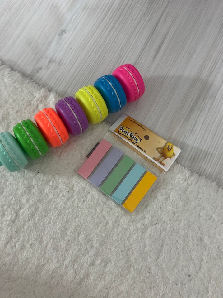 Pastel renkli yapışkan notlar ve renkli makaron şeklinde silgilerden oluşan okul aktivite seti. Makaron fosforlu kalem sadece üç rengi kullanımda yanında not kağıdı ile birlikte
