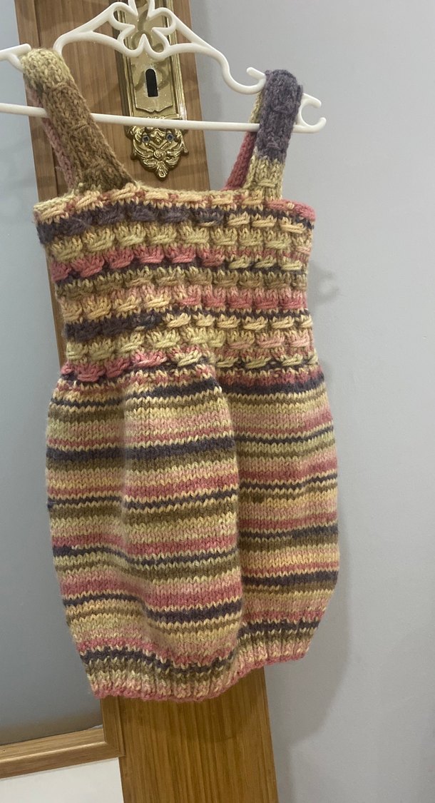 Pastel renklerde, örgü bebek kız askılı örgü elbise tasarımıyla yumuşak ve rahat bir seçenek.0/2 yaş için