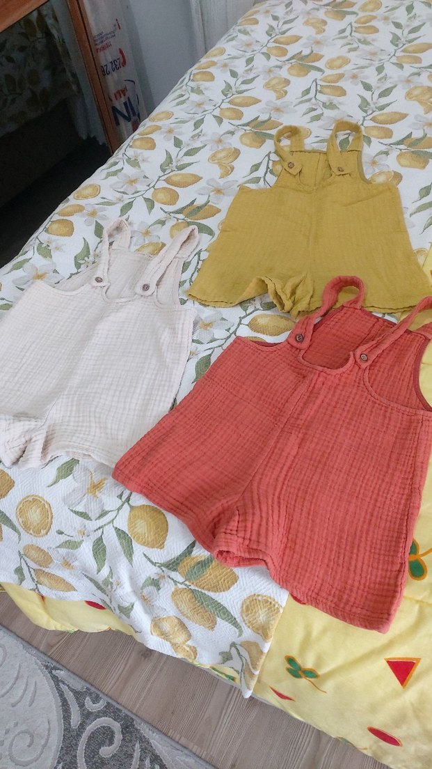 Beyaz, sarı ve mercan pastel tonlarda yumuşak örgü bebek kız tulumları. Desensiz, rahat ve yumuşak dokulu tulumlar.