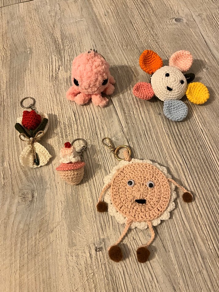 Pastel tonlarda örgü bohem anahtarlıklar, çiçek, hayvan ve tatlı gibi eğlenceli ve rahat tasarımlarla. Retro hippie tarzına uygun.