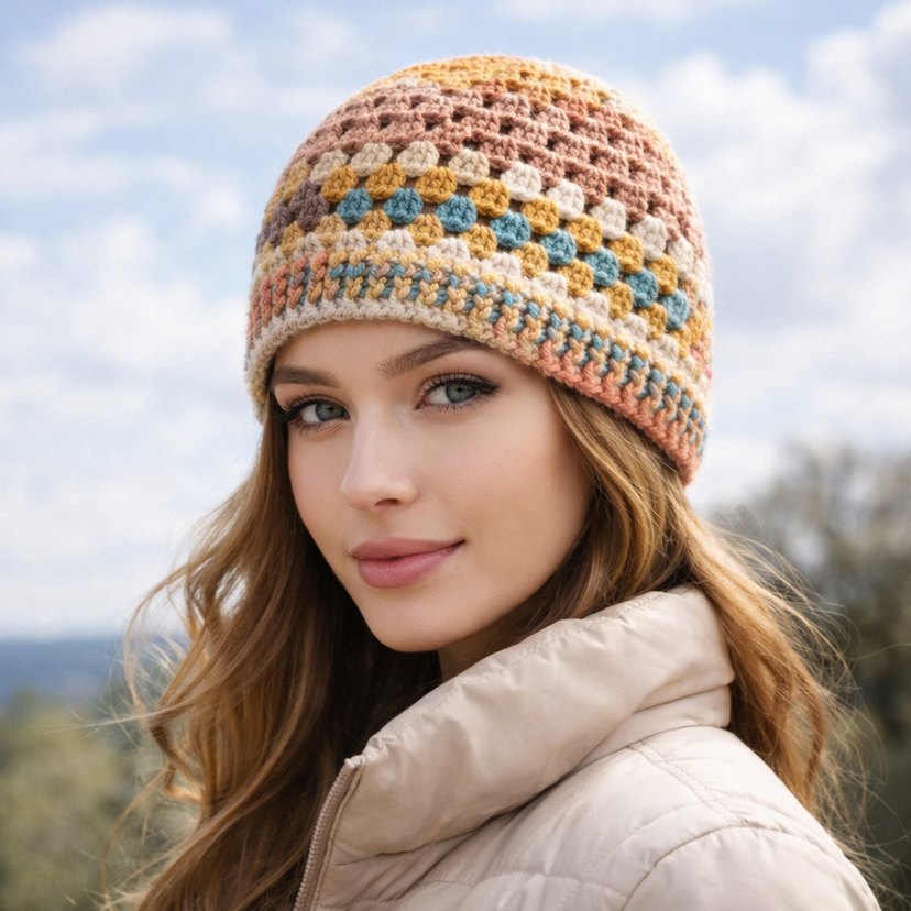 Pastel renklerde çok renkli, örgü bohem tarzında kadın bere. Yumuşak örgü yapısıyla sıcaklık ve özgün el işi görünümü sağlar. İstenilen renkte sipariş örülür .