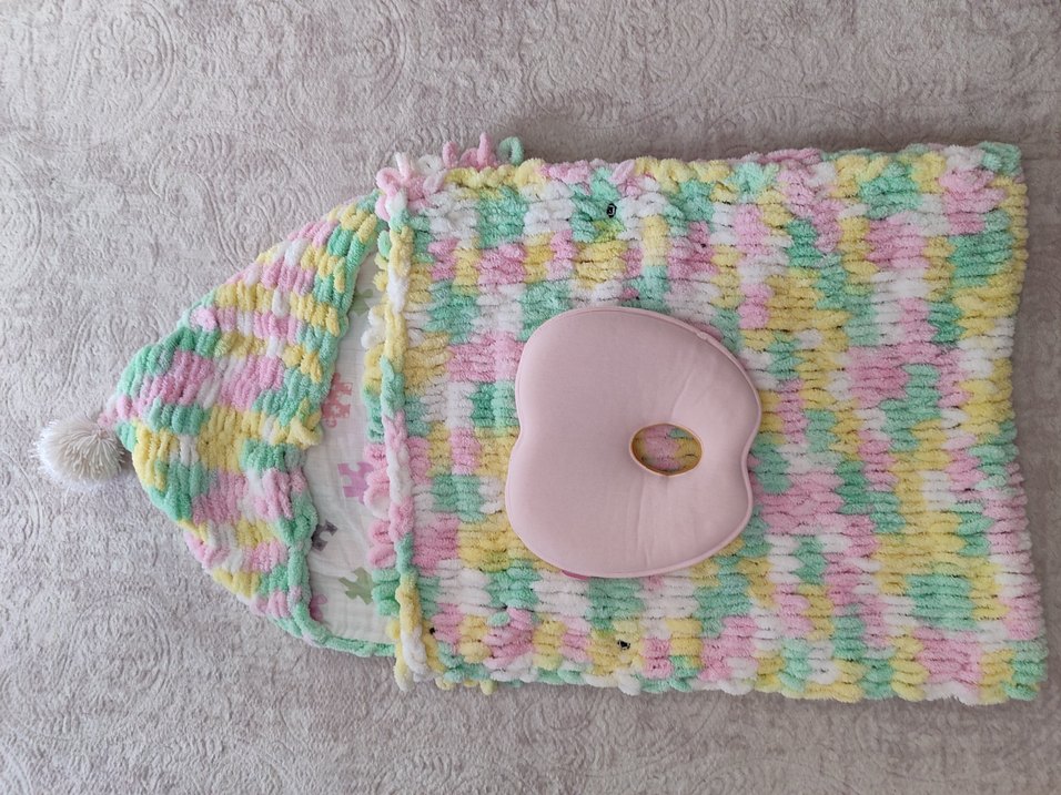 Pastel tonlarda, çok renkli ve batik desenli yumuşak örgü çocuk battaniyesi. Ortasında destek için delikli pembe yastık bulunur.