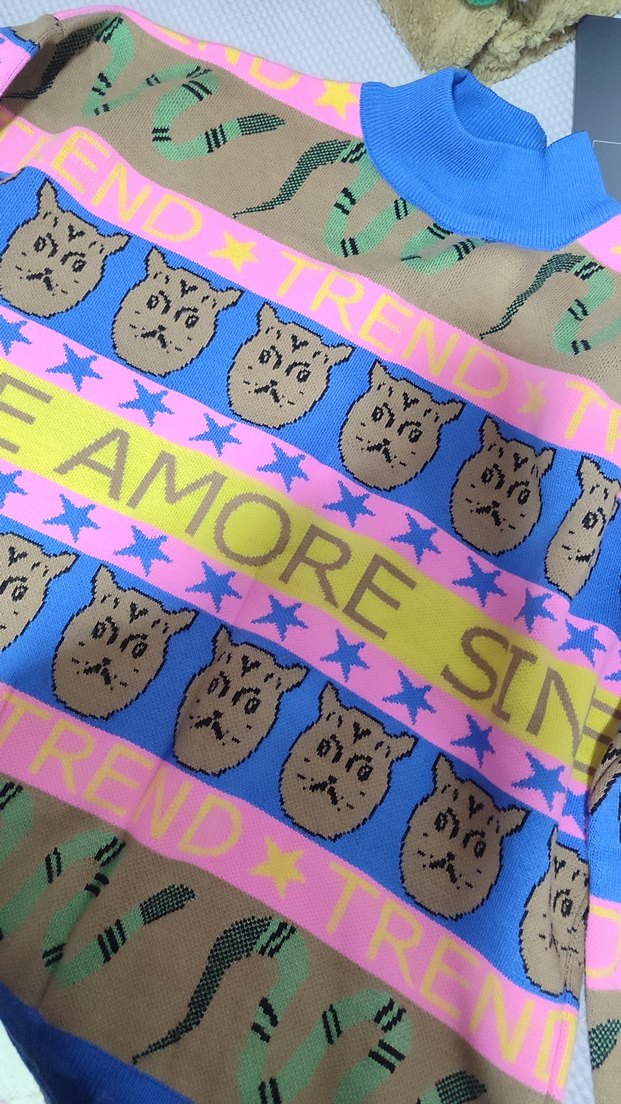 Pastel çok renkli, örgü kumaştan yapılmış, kedi yüzleri ve yıldız desenleriyle sokak stili kedi kıyafeti. Üzerinde "AMORE" ve "TREND" yazıları bulunur. büyük bedendir