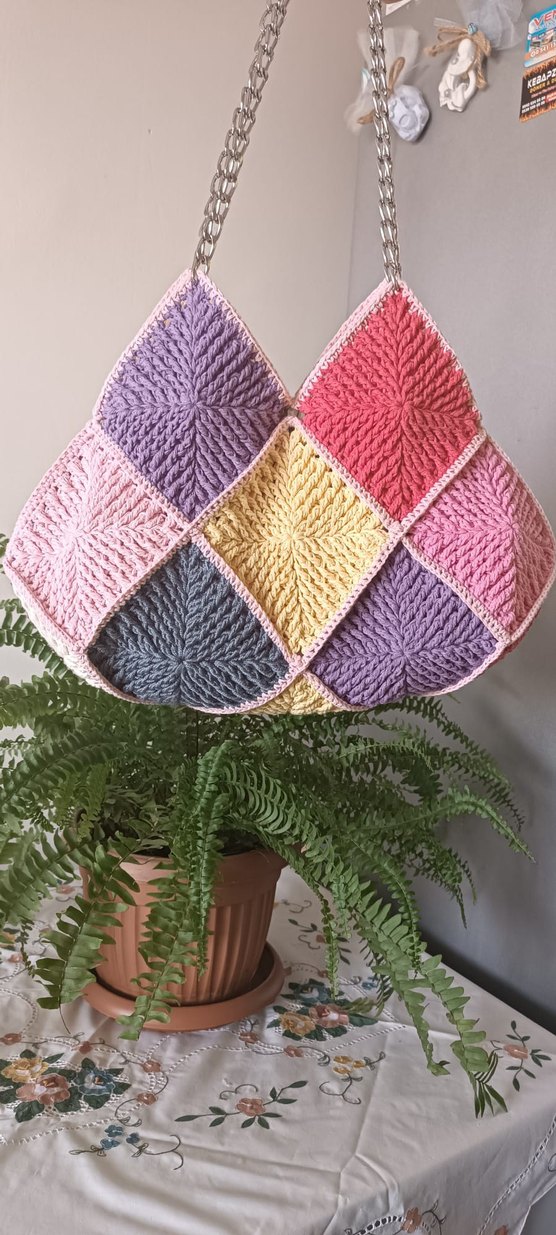 Bohem tarzda, örgü işçiliği ile pastel renklerde, desen içermeyen, günlük kullanıma uygun kadın çantası.