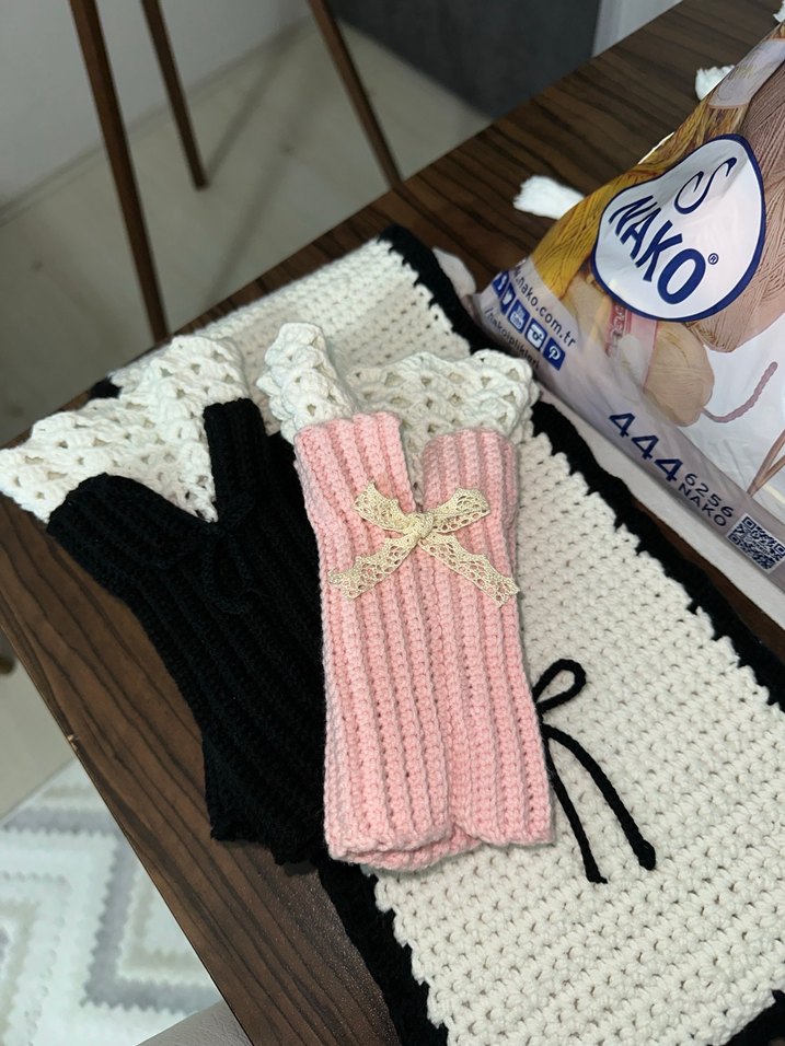 Pastel renklerde, örgü kumaştan yapılmış kadın eldivenleri. Goth tarzı ve rahat bir görünüme sahip, dantel fiyonk detayı bulunur. Üzerinde 'NAKO' markası yer alır.