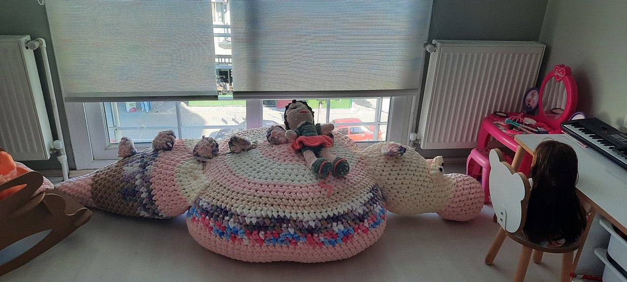 Yumuşak dokulu pastel renkli el örgüsü puf. Dinozor puf, istenilen renk çalışılır. Boyutu çok büyük fotoğraflardan anlaşıldığı gibi. İzmir içinden elden teslim de edilebilir. Kargo için fazla büyük