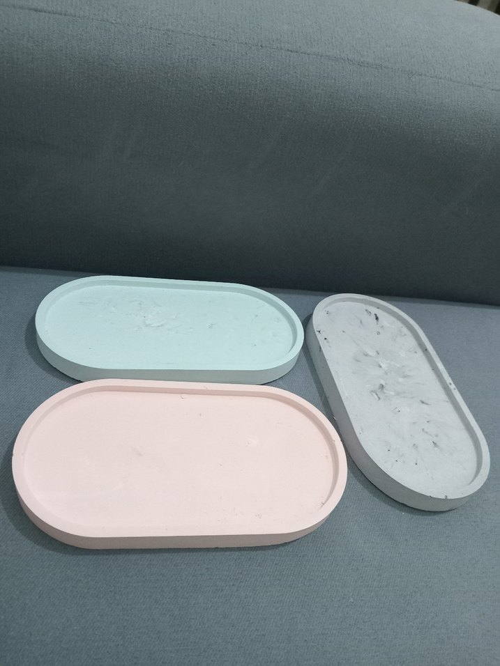 Beyaz, pembe ve açık mavi pastel renklerde oval makyaj organizer tepsileri. Kozmetik ve aksesuarlar için düzen sağlar.TOPLU ALIMDA HAM OBJE 40 TL