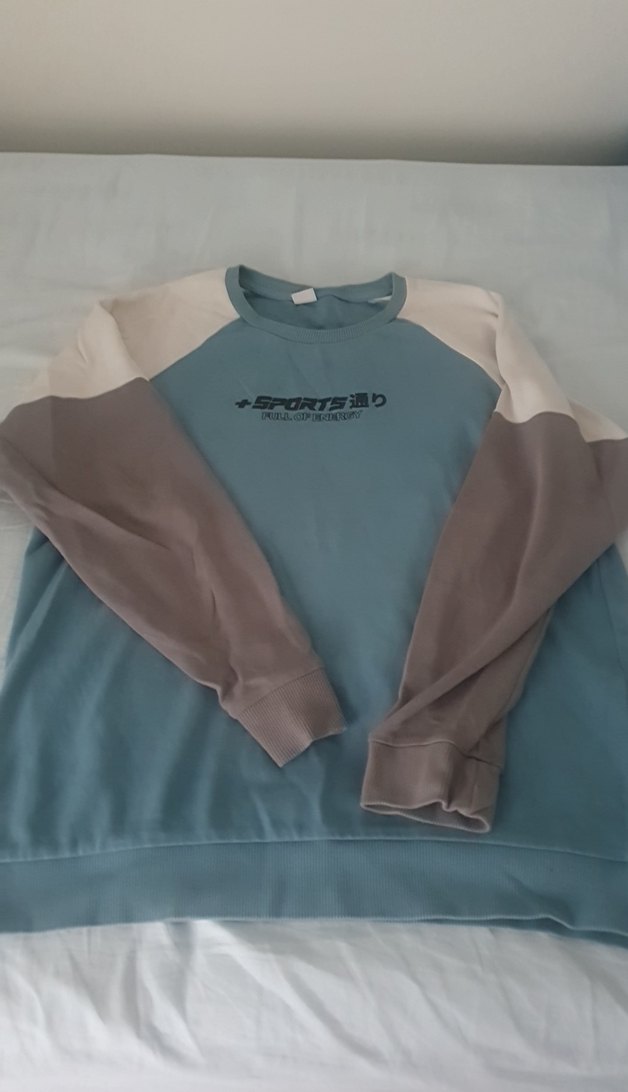 sweatshirt, uzun kollu ve yuvarlak yaka olup, bol kesim ve normal boydadır. Pastel mavi taban, kontrast kollu ve baskılıdır, yumuşak ve sıcak kumaştan üretilmiştir.